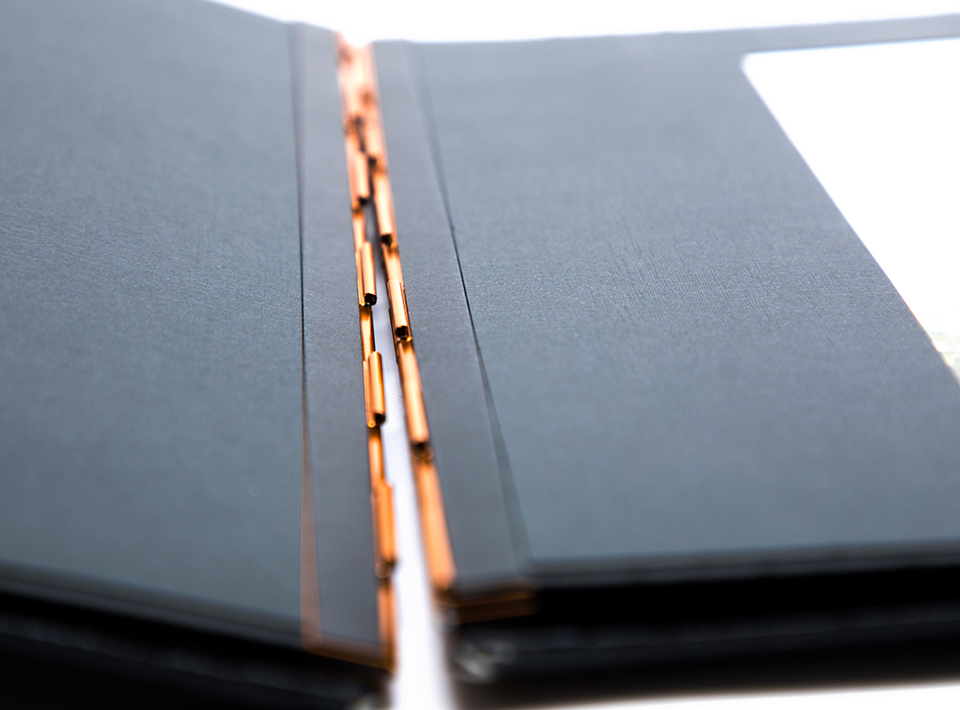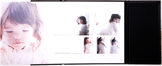 ヴィンテージ感漂うインテリアレザー調の外観に、中ページには高級光沢紙を使用。ちょっと大人なクールビューティなアルバムです。